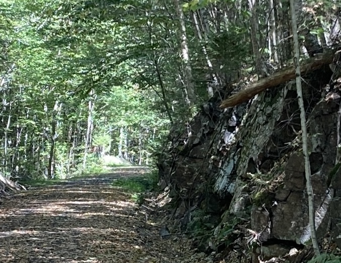 Shade along the PRT, and a rock cut dating back to rail days. Ellen Kolb photo.