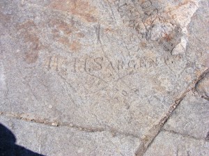 Carved into the ledge near the Kearsarge summit, approaching from the Rollins side, are many neatly-lettered names. I wish I knew the history of this one: H.H. Sargent. Do the crossed swords indicate a veteran?