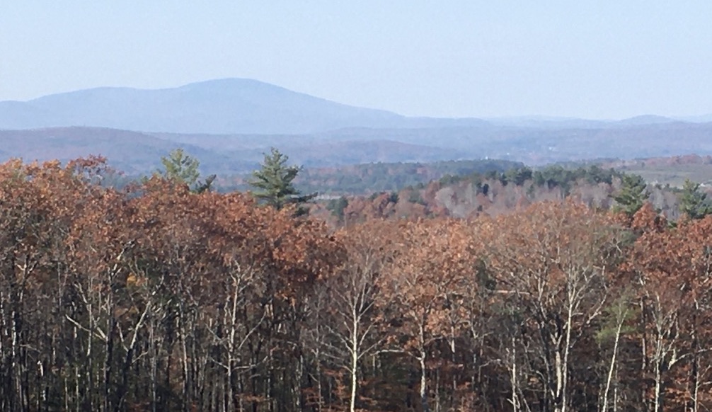One afternoon in early October, I headed to Concord’s Oak Hill trails. I should’ve known what to expect: I-93 southbound was jammed with leafpeepers coming home from the North Country, where foliage at that time was at its most colorful. I figured Oak Hill, with colors just beginning to change in the Concord area, would be quiet. Nope: I had to squeeze my little car into about three-quarters of a space in the Shaker Road lot. I knew right away that the path to the fire tower would be busy, and I wanted some solitude. Fortunately, Oak Hill offers several miles of paths from which to choose. I went to an old favorite – a little ledge with a bench and a nice view toward the west featuring Mt. Kearsarge’s distinctive gentle profile.